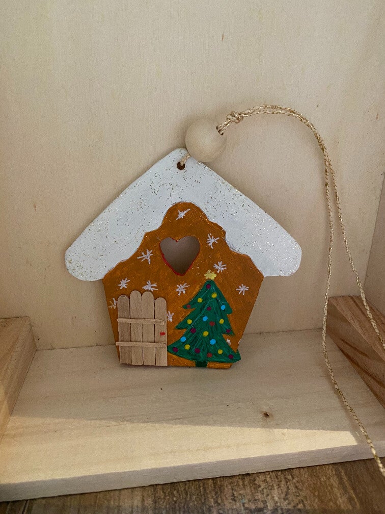 Objet de décoration de Noël à suspendre recto/verso. Réalisé en bois CP ou MDF chantourné. Peint à la main, peinture acrylique vernie.